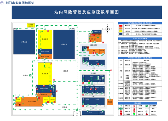 加壓站在站內(nèi)全面推行安全風(fēng)險(xiǎn)分級(jí)管控和隱患排查治理雙重預(yù)防機(jī)制,對(duì)作業(yè)現(xiàn)場(chǎng)可能存在的安全風(fēng)險(xiǎn)進(jìn)行全面識(shí)別、評(píng)估和分級(jí),同時(shí)制作風(fēng)險(xiǎn)四色圖和風(fēng)險(xiǎn)告知牌,將安全風(fēng)險(xiǎn)等級(jí)從高到低按區(qū)域依次劃分為重大、較大、一般和低風(fēng)險(xiǎn),分別用紅、橙、黃、藍(lán)四種顏色標(biāo)示,明確不同區(qū)域的風(fēng)險(xiǎn)等級(jí)、防范措施和相關(guān)責(zé)任人,以最直觀的方式展示作業(yè)現(xiàn)場(chǎng)的安全風(fēng)險(xiǎn)及防范措施。根據(jù)風(fēng)險(xiǎn)四色圖和風(fēng)險(xiǎn)告知牌外來(lái)人員能了解所處區(qū)域可能存在的風(fēng)險(xiǎn),做好自身防護(hù),施工人員則可以做好施工前的風(fēng)險(xiǎn)管控,降低作業(yè)過(guò)程中的安全風(fēng)險(xiǎn)。