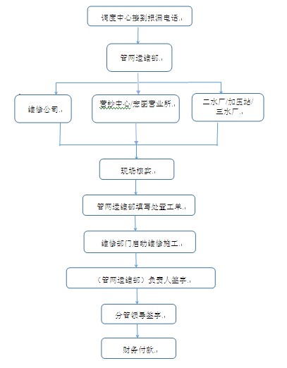 3、市政管網(wǎng):管網(wǎng)運(yùn)維部聯(lián)系維修公司(或營抄中心、宏圖營業(yè)所);原水管道:管網(wǎng)運(yùn)維部聯(lián)系二水廠(或加壓站、三水廠);