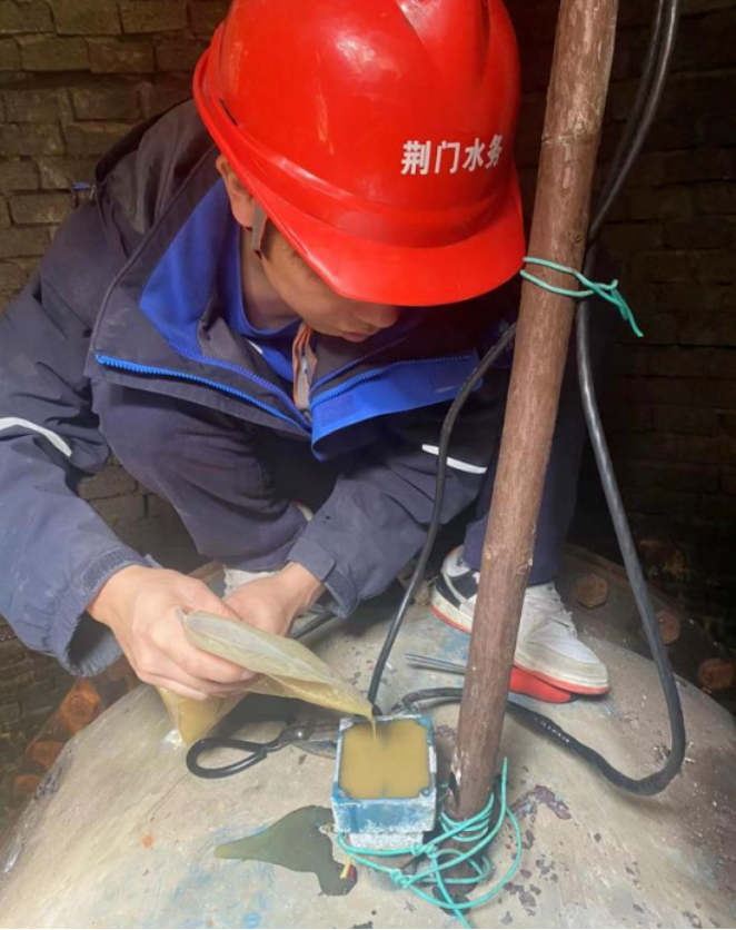廠領(lǐng)導(dǎo)在綜合評估后,同意其思路,并作安全操作提醒。雖早有心理準(zhǔn)備,但在打開接線盒后的瞬間,李為龍等人還是倒吸一口涼氣。他們發(fā)現(xiàn)整個(gè)接線盒內(nèi)部被深色不透明的膠體充滿,無法掌握線路走向。短暫思索后,他們發(fā)揮水務(wù)人不怕苦、能戰(zhàn)斗的精神,嘗試按廠家給出建議,用熱風(fēng)槍加熱密封膠,但事與愿違,效果并不理想,密封膠沒有自動融化流出。李為龍“改巧為笨”,在加熱的同時(shí)用小刀清理變軟的膠體。該處操作空間狹小,且不能損壞內(nèi)部的線路和接線端子,必須凝神聚力,是個(gè)“精細(xì)活”“體力活”。即便同事們輪番上陣,依然個(gè)個(gè)汗如雨下。功夫不負(fù)有心人,眾人合力熬過“漫長的”4小時(shí),最終完成了既定任務(wù)。