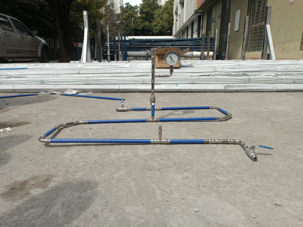 圖為技術(shù)人員正在對薄壁不銹鋼管道進行打壓測試
