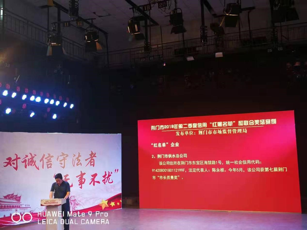 7月24日下午,荊門市社會信用體系建設(shè)領(lǐng)導小組辦公室、市發(fā)改委、人行荊門市中心支行聯(lián)合組織召開第二季度信用“紅黑名單”和聯(lián)合獎懲案例發(fā)布會。會上,市供水總公司被授予“全市市場監(jiān)管領(lǐng)域守信企業(yè)”榮譽稱號,入選荊門市守信企業(yè)“紅名單”。