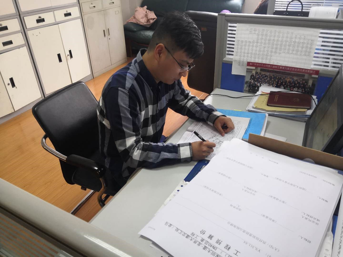 劉貝的主要工作是用戶報(bào)裝接待、現(xiàn)場(chǎng)勘察、圖紙預(yù)算審核傳遞、工程合同擬定、下發(fā)施工通知單、客戶咨詢等。2019年,他共受理用戶現(xiàn)場(chǎng)勘察約700起,平均每周約15起,勘察范圍西至宏圖愛(ài)飛客小鎮(zhèn)、東至彭墩長(zhǎng)壽產(chǎn)業(yè)園、南至團(tuán)林汽車(chē)工業(yè)園、北至子陵萬(wàn)華工業(yè)園等,全年共擬定各類(lèi)大小合同約340份,下發(fā)各類(lèi)施工通知單約500份,從未受到用戶投訴。