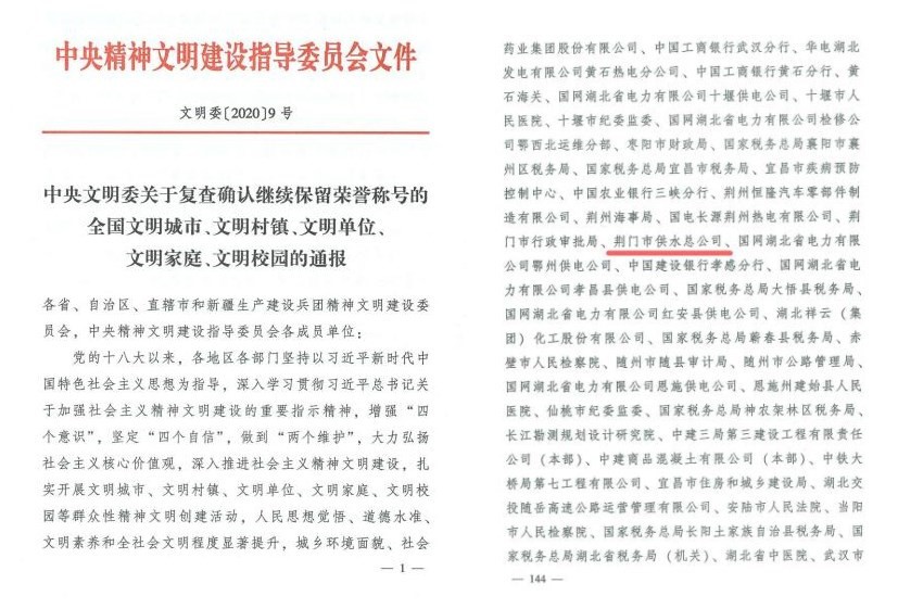 據(jù)悉,“全國(guó)文明單位”稱(chēng)號(hào)是中央文明委授予創(chuàng)建單位的最高榮譽(yù)。市供水總公司繼續(xù)保留榮譽(yù)稱(chēng)號(hào),是企業(yè)文明單位創(chuàng)建活動(dòng)扎實(shí)推進(jìn)、創(chuàng)新發(fā)展的一大豐碩成果。公司連續(xù)十一屆被省委、省政府授予省級(jí)文明單位,連續(xù)十二屆被市委、市政府授予市最佳文明單位,2017年被中央文明辦授予“全國(guó)文明單位”。2018年,在市消費(fèi)者委員會(huì)發(fā)起的公服企業(yè)滿(mǎn)意度調(diào)查中,公司總成績(jī)排名第一,被授予“消費(fèi)者滿(mǎn)意單位”和“消費(fèi)者滿(mǎn)意品牌”。2019年,由于成功推行卓越績(jī)效管理和用戶(hù)滿(mǎn)意管理,被市政府評(píng)選為第七屆荊門(mén)市“市長(zhǎng)質(zhì)量獎(jiǎng)”獲獎(jiǎng)企業(yè);因全面推進(jìn)依法治企,被評(píng)為湖北省省級(jí)“法治建設(shè)示范企業(yè)”;被荊楚網(wǎng)表彰為“全省優(yōu)秀政務(wù)微信公眾號(hào)”;作為全國(guó)唯一一家供水企業(yè),榮獲2019年全國(guó)市場(chǎng)質(zhì)量信用AA等級(jí)“用戶(hù)滿(mǎn)意企業(yè)”稱(chēng)號(hào)。2020年,公司先后被評(píng)為荊門(mén)市建設(shè)江漢平原振興發(fā)展示范區(qū)先進(jìn)集體,在全市要素保障類(lèi)滿(mǎn)意度測(cè)評(píng)中繼續(xù)名列榜首。三水廠(chǎng)團(tuán)支部被共青團(tuán)中央表彰為“全國(guó)五四紅旗團(tuán)支部”。詠泉水質(zhì)檢測(cè)有限公司曹俊同志榮獲“全市優(yōu)秀共產(chǎn)黨員”和“荊門(mén)市抗擊新冠肺炎疫情先進(jìn)個(gè)人”榮譽(yù),供水維修班長(zhǎng)黃磊獲評(píng)“荊門(mén)好人·最美逆行者”榮譽(yù)稱(chēng)號(hào),加壓站員工閆寒家庭榮獲2020年“最美家庭”榮譽(yù)稱(chēng)號(hào)。